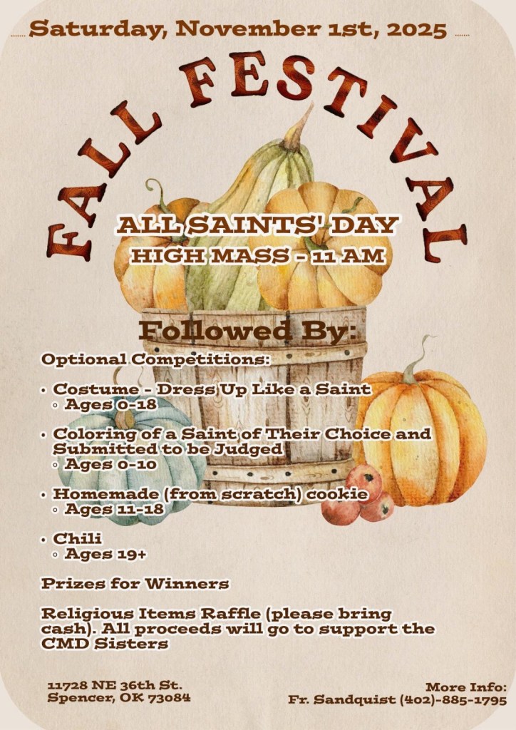 November is blowing in with a weekend whirlwind of opportunities for enriching your spiritual life. The announcements from the November bulletin are excerpted here for a ready reference. The full bulletin with Mass schedule is on the “Monthly Bulletin” page linked in the tabs. The Fall Festival flyer is re-published below the announcements, but please note that Fr. Sandquist wants all submissions for the coloring contest to use the pdf file of Our Lady of Sorrows at the end of this post. Coloring the picture at home prior to the contest is encouraged.