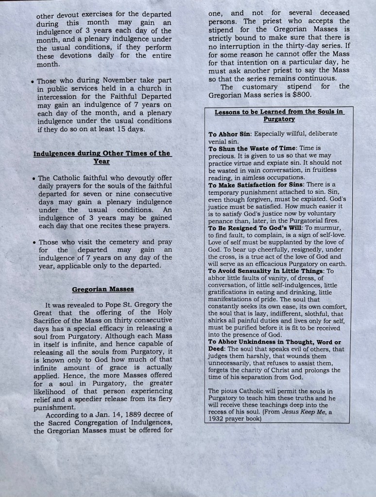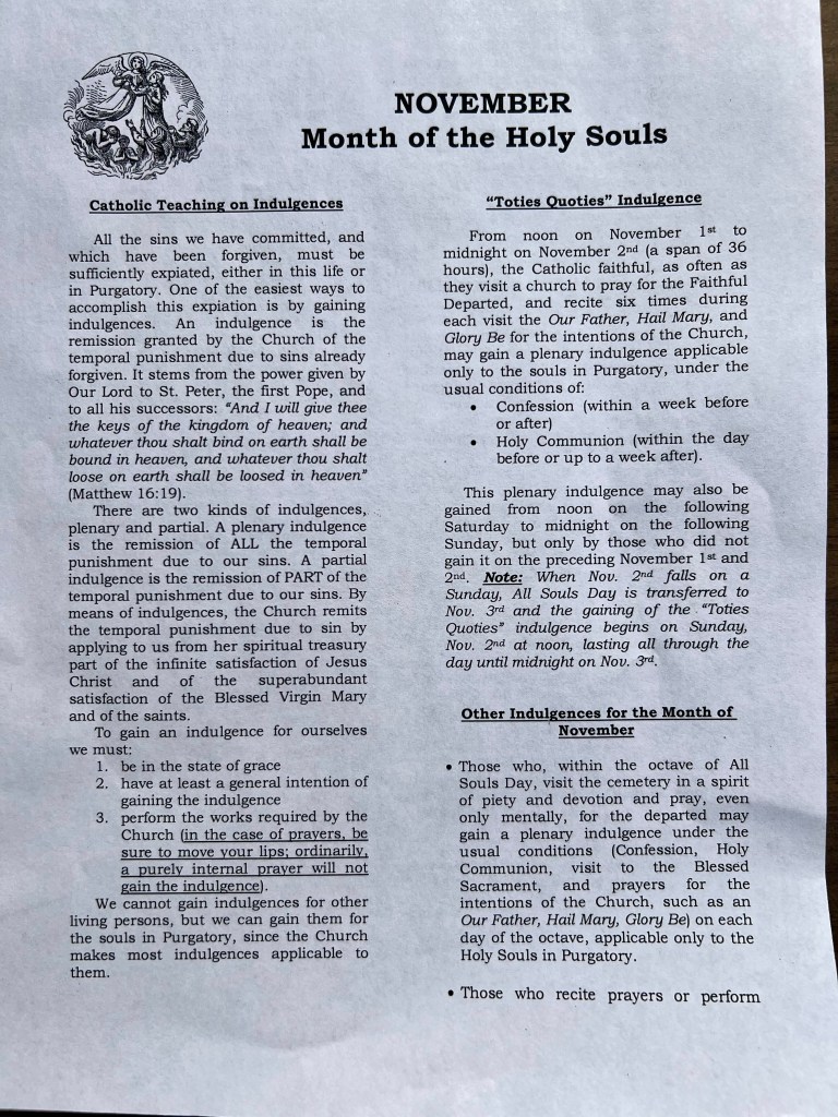 This Saturday, November 2, the Church celebrates the feast of All Souls. Fr. Sandquist will be offering three Masses in Spencer, Oklahoma, at Our Lady of Mt. Carmel.